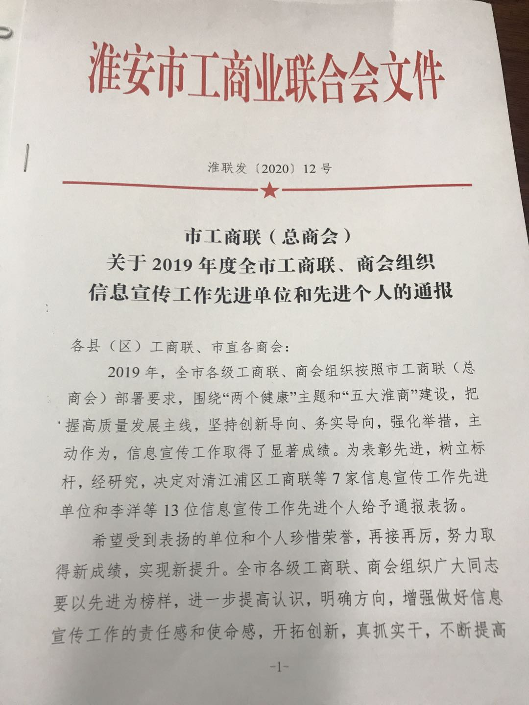 贏夏人才、淮安人才熱線CEO孟常委榮獲2019年度淮安市商會組織信息宣傳工作先進個人