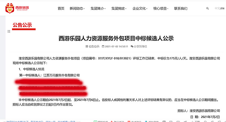 7月2日,從西游集團(tuán)官方網(wǎng)站了解到江蘇萬高服務(wù)外包有限公司以第一名的優(yōu)秀成績成功中標(biāo)淮安西游樂園有限公司人力資源服務(wù)外包項(xiàng)目(項(xiàng)目編號(hào):XYJT/XYLY-018/013021),淮安西游樂園有限公司在西游集團(tuán)官網(wǎng)公布了中標(biāo)候選人