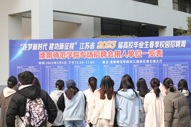 3月4日,“逐夢新時代 建功新征程”江蘇省2023屆高校畢業(yè)生春季校園招聘周淮陰師范學院專場招聘活動在長江路校區(qū)崇文樓大廳舉行。220余家企業(yè)及近4000余名畢業(yè)生參加活動。