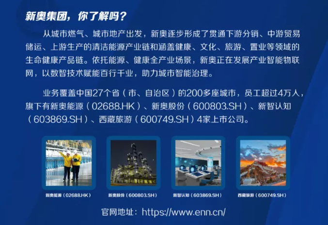 新奧集團(tuán)1989年在河北廊坊創(chuàng)業(yè)起步,致力于創(chuàng)建現(xiàn)代能源體系、提高人民生活品質(zhì),成為一家受人尊敬的創(chuàng)新型智慧企業(yè)。從城市燃?xì)?、城市地產(chǎn)出發(fā),逐步形成了貫通下游分銷、中游貿(mào)易儲運(yùn)、上游生產(chǎn)的清潔能源產(chǎn)業(yè)鏈和涵蓋健康、文化、旅游、置業(yè)等領(lǐng)域的生命健康產(chǎn)品鏈。依托能源、健康全產(chǎn)業(yè)場景,新奧正在發(fā)展產(chǎn)業(yè)智能物聯(lián)網(wǎng),以數(shù)智技術(shù)賦能百行千業(yè),助力城市智能治理。旗下有4家上市公司、4萬多名事業(yè)伙伴,2020年營收1436億元。