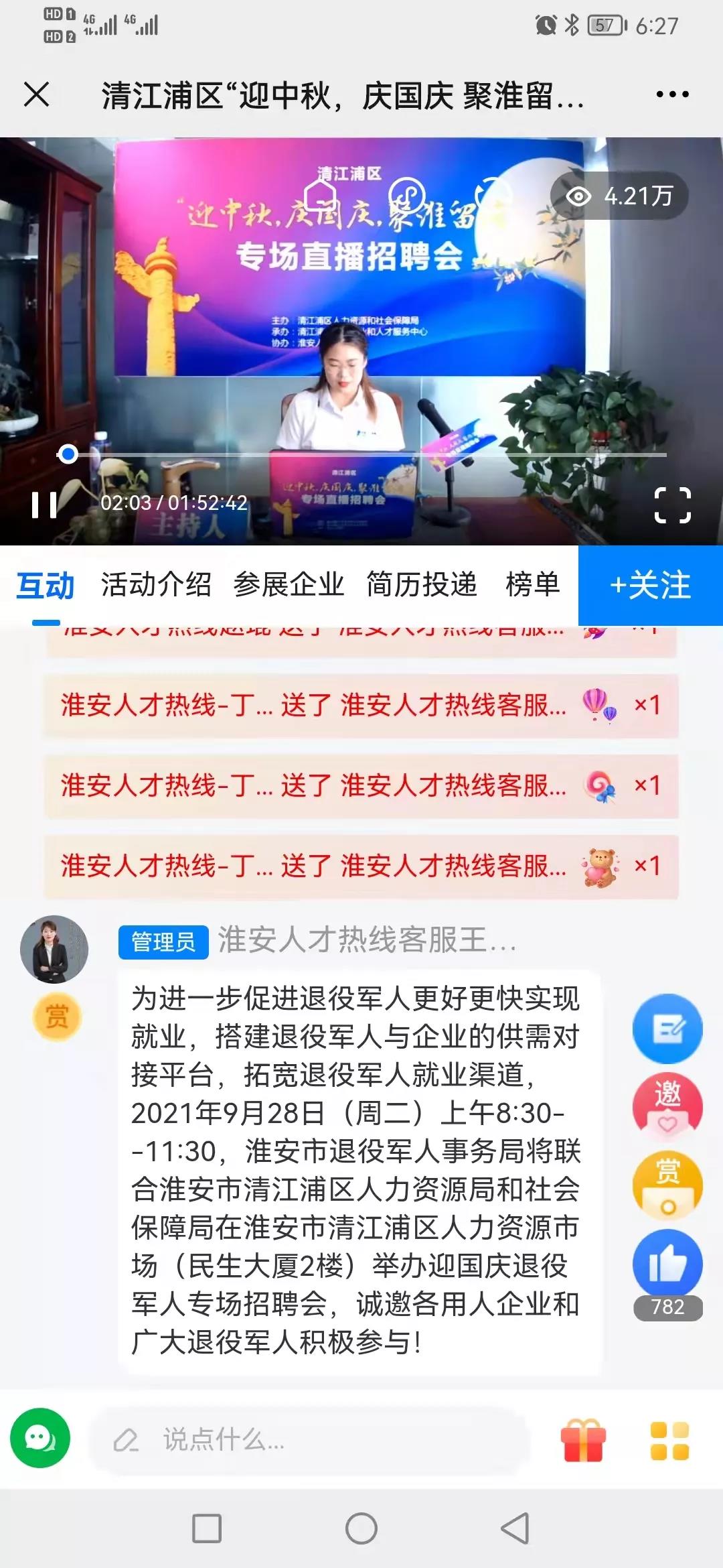 萬家團圓迎中秋,四海歡騰慶國慶。為慶祝偉大祖國72周年華誕,弘揚中華傳統(tǒng)佳節(jié)文化,同時打造服務(wù)大局、服務(wù)淮安就業(yè)的品牌工程,吸引廣大人才就業(yè)者的青睞,切實為我市廣大求職人才及企業(yè)搭建優(yōu)質(zhì)交流平臺,拓寬就業(yè)渠道,為我市引進人才助力轉(zhuǎn)型發(fā)展提供智力支持。2021年9月17日清江浦區(qū)人力資源和社會保障局成功開展“迎中秋,慶國慶 聚淮留浦”專場直播招聘活動,參展企業(yè)11家,提供5000+招聘崗位,吸引了4.2萬+求職者觀看。