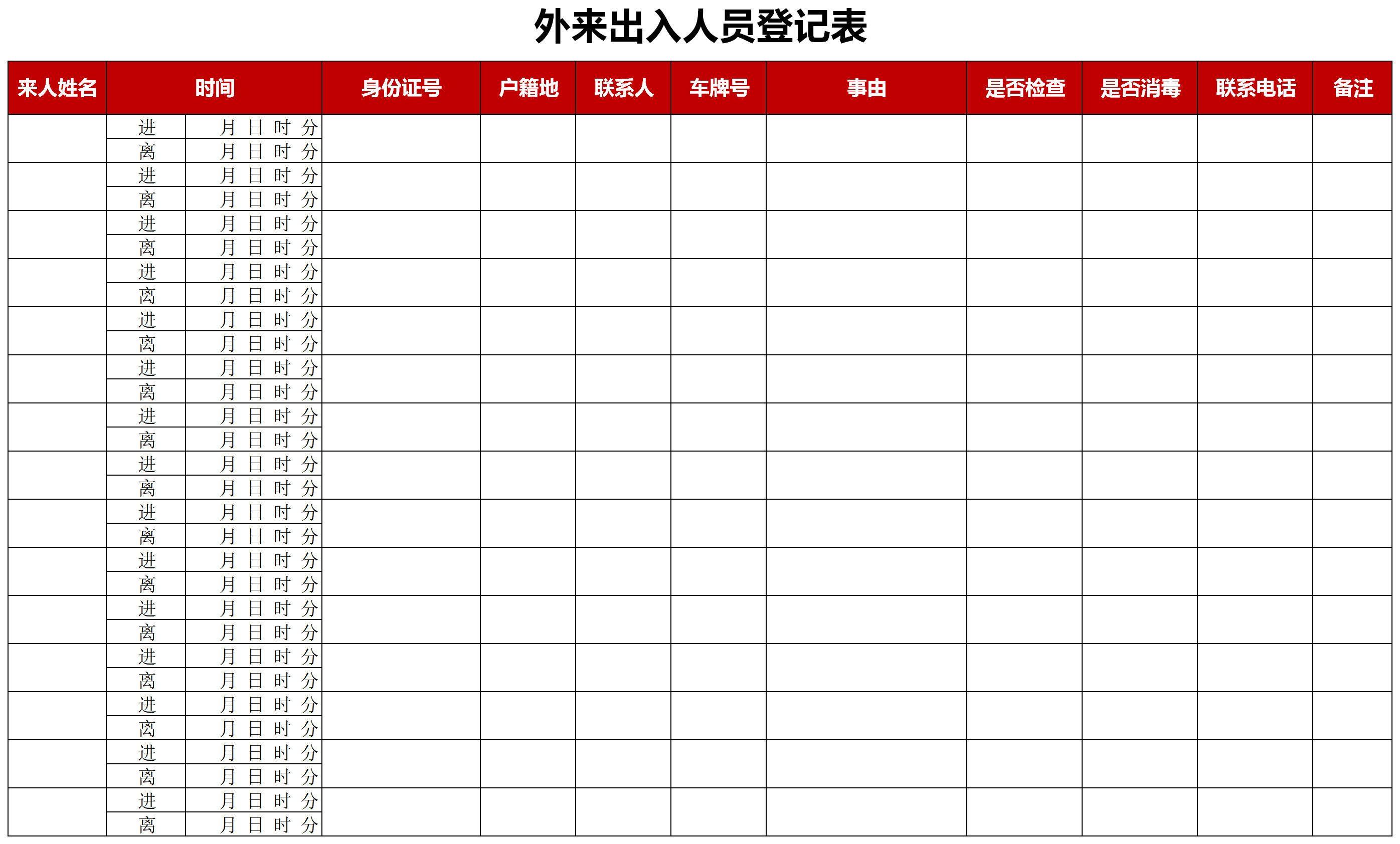 春節(jié)返工除了內(nèi)部員工的返工信息追溯,外來人員的傳播感染風險更應嚴防死守。外來出入人員登記表,登記訪客及車輛信息,以表格記錄監(jiān)督來訪人車的消毒及檢查工作,確保防控細節(jié)管理到位。